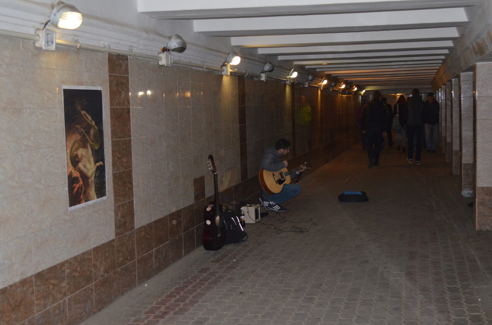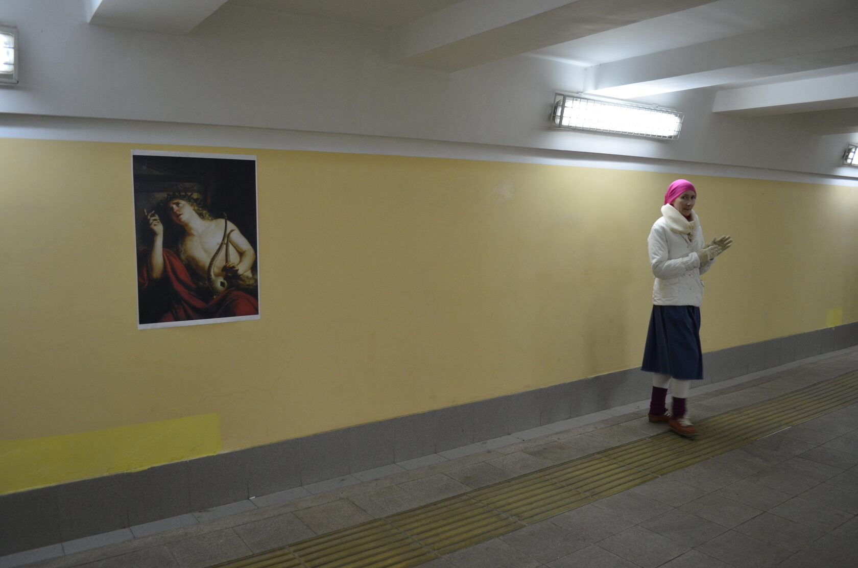 В работе я исследую тему потоков и трафика, а также «надземное/высокое» и «подземное/низкое» через связь образов сладкоголосого орфея и «бродячих» музыкантов. Часто уличные музыканты воспринимаются обществом как маргинальный слой, хотя некоторые приходят в переходы попеть из-за хорошей акустики. Уличных музыкантов воспринимают как непрофессионалов и попрошаек, а если у человека обнаруживается талант, то это видится как что-то невероятное. Образ Орфея выбран как символ «высокого», а уличные музыканты как что-то «низкое».